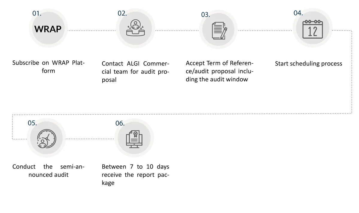 Attaining a WRAP certification involves a 5-step process. It begins with the production facility filing an initial application with WRAP and paying the registration fee. Then the facility will conduct a pre-audit self-assessment of its compliance with WRAP’s 12 Principles, which is followed by an additional audit conducted by Sustain Veritas, as one of the accredited monitoring partners. The audit report is sent to WRAP, which decides whether or not a certification is granted.